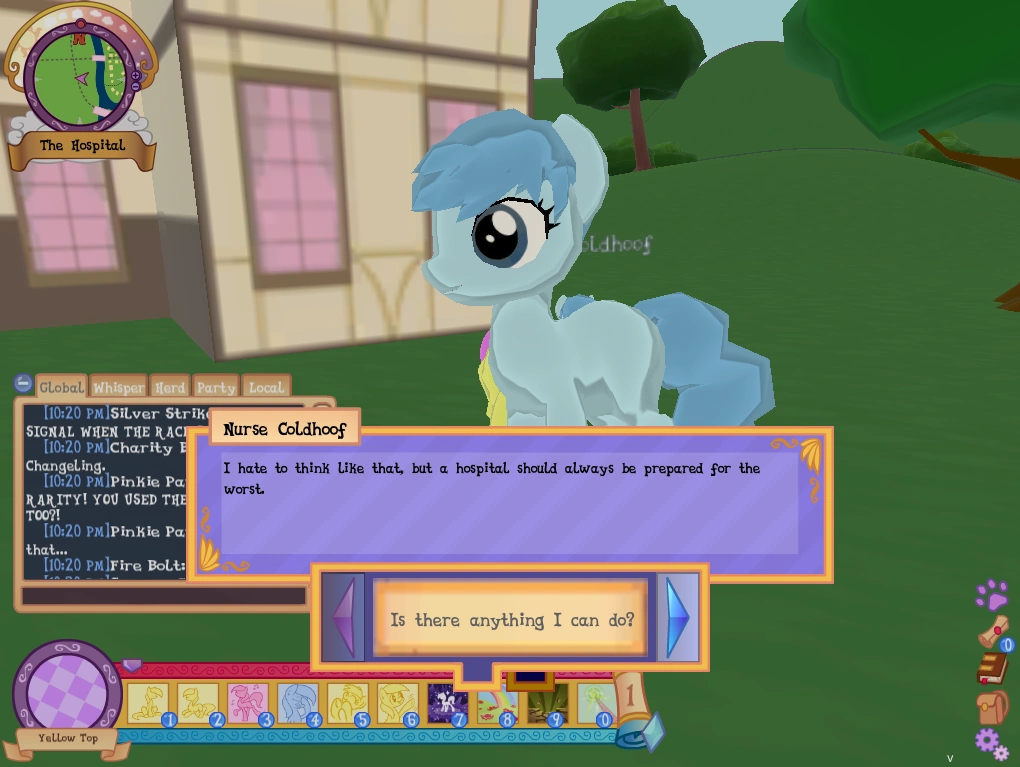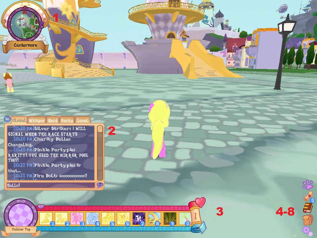 Ponies of different races start in one of the three main cities. Earth ponies spawn in Ponydale, unicorn ponies spawn in Cantermore, and pegasus ponies spawn in Cloudopolis. Teachers are stationed outside of the respective schools and must be contacted for movement basics, starting quests, and later, possibly after the foal-only quests were completed, the talent quest. After learning their talent, the player's pony will become an adult, and they are able to attend graduation.