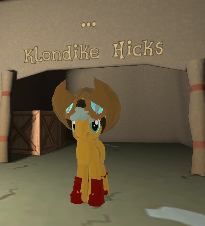 Klondike Hicks is an Earth pony NPC, located in a large cavern inside the Gem Mines. He speaks in a typical Southern American accent, as shown by his dialogue. Talking to him is required to start the Klondike Hikes quest.