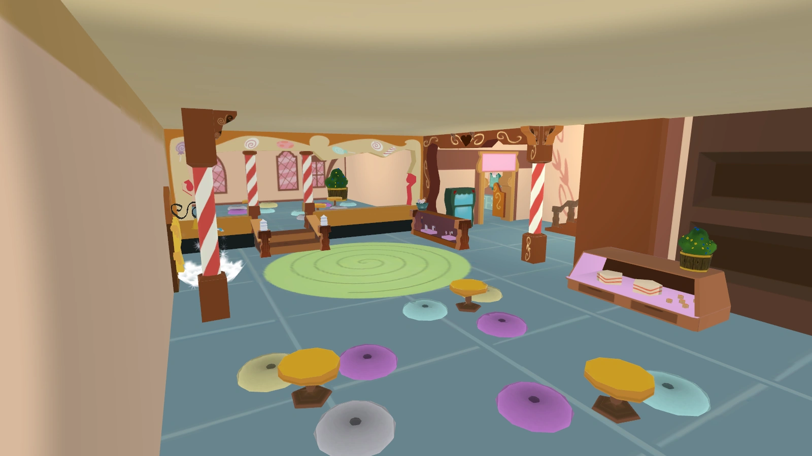 Sugarcane Corner is a building that players can enter in Ponydale. This building is rather easy to find among the other buildings, as its roof looks like a frosted ginger bread among the other straw roof houses. Players can access the main room, the kitchen, and the second floor. However, the home area, which resembles stacked cupcakes atop the building's roof, does not appear to be accessible. Throughout the previous Open Server Events and into Open Access, live music from the community of bronies has served as the soundtrack for Sugarcane Corner, currently from PonyvilleFM.