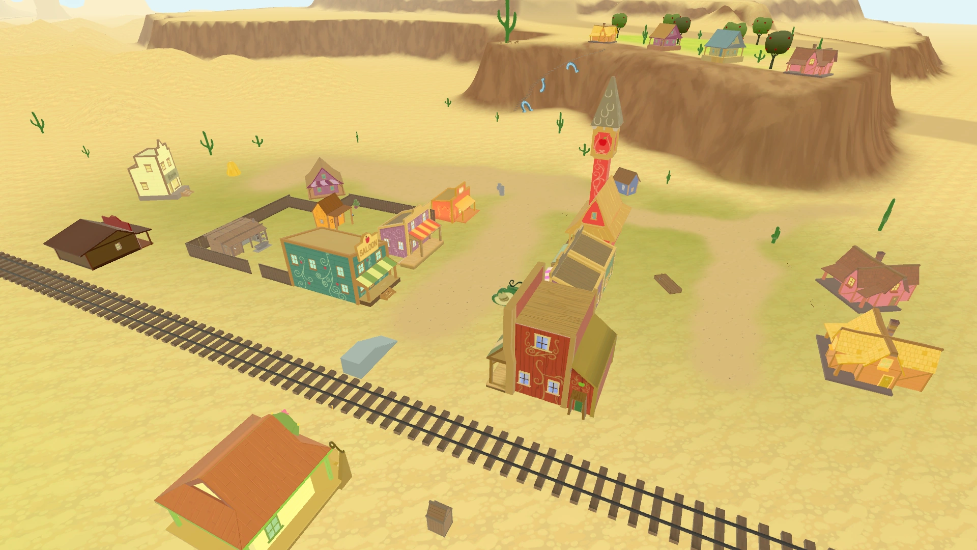Soaring high over the Frontier, this plateau can only be climbed via a rickety staircase that leads to a treacherous trail wrapping around the face of the cliff. Brave ponies who make the climb are rewarded with a spectacular view and the chance to mine Elementium Crystals. The entrance to the Applewood Mines is located at the bottom of the side of the plateau facing Dodge Juncture.